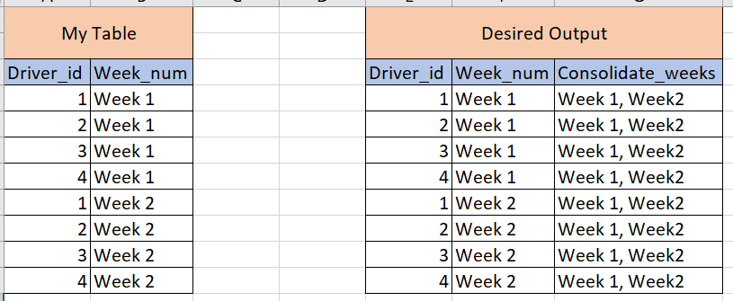 SELECT Driver_id,GROUP_CONCAT(Week_num) Consolidate_weeks