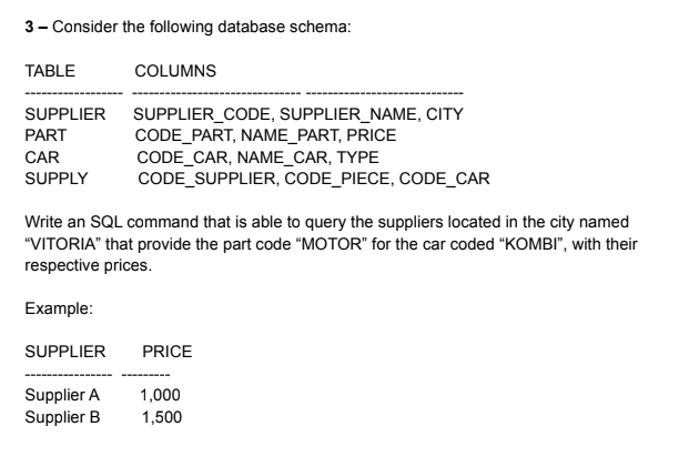 WHERE (supplier.CITY='VITORIA' AND part.NAME_PART='MOTOR' AND car.NAME_CAR='KOMBI' );