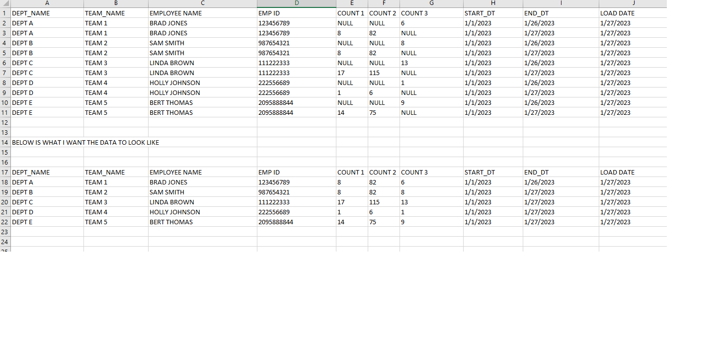 I assumed t.dept_name, t.team_name, t.employee_name, t.emp_id is the way you want to group them, and that only one of the two records will hold a value for the counts (if not you need to decide which one you want). Also the dates weren’t clear, because for dept a you chose the first one and for the rest you chose the second one, so I used max.