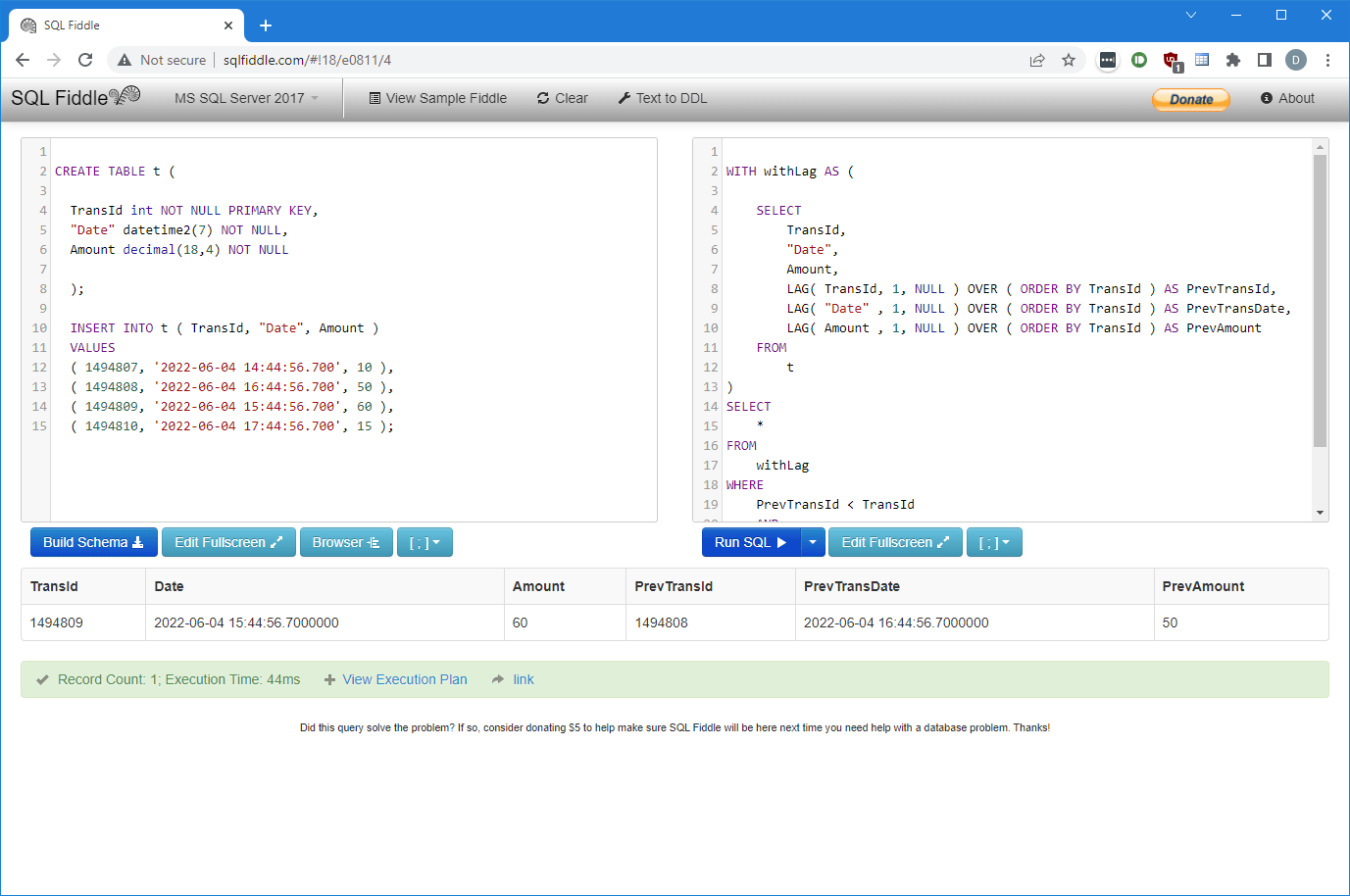 LAG( Amount , 1, NULL ) OVER ( ORDER BY TransId ) AS PrevAmount