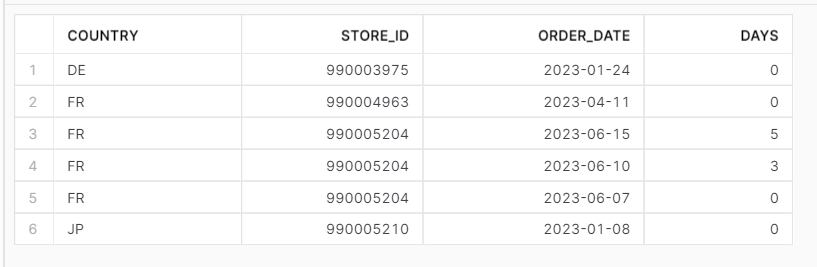 | COUNTRY | STORE_ID | ORDER_DATE | DAYS |