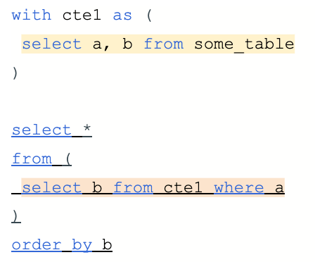 In the example query displayed in this image, there are exactly three of these "things": one highlighted in yellow, one highlighted in orange, and one underlined. (The underlined "thing" also includes the orange-highlighted subquery). Is there a generic name that captures all three, but not the entire query?
