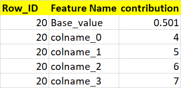 a) Create a new dataframe (dummy) with 3 columns such as ROW_ID, FEATURE NAME, Contribution