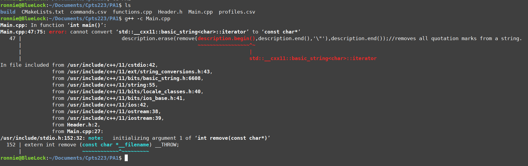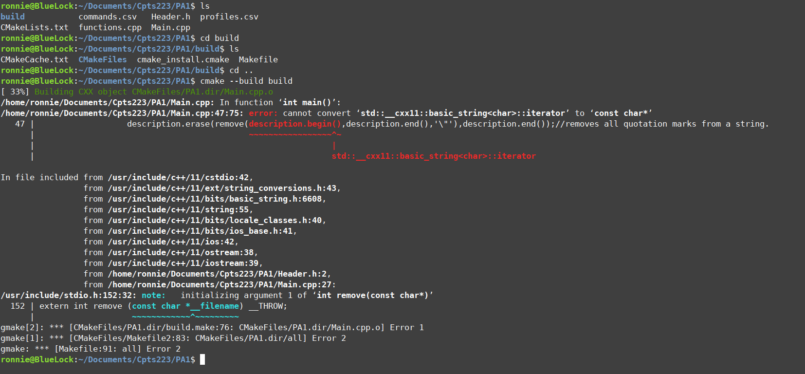 I was working on a project for my class through visual studio(windows) because I like the compiler a bit more, but when I copy/pasted the code to ubuntu linux(linux mint cinnamon) and ran both a g++ compiler and a cmake build on it, the string functions did not seem to be defined correctly and I received the following errors.