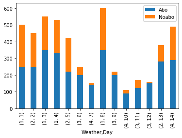 df.set_index(['Weather', 'Day'])[['Abo', 'Noabo']].plot.bar(stacked=True)