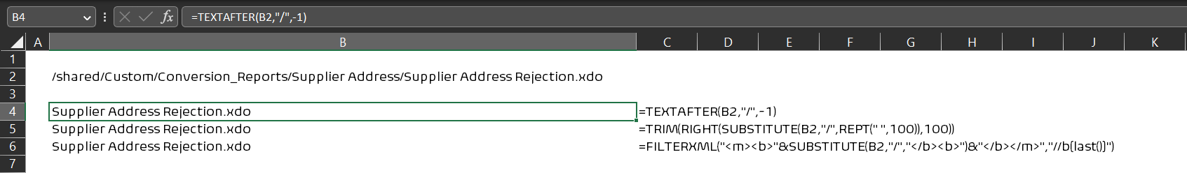 I would like to apply some type of formula that will find the last occurence of a forward slash character (/) and then output everything to the Right of it. Below is an example: