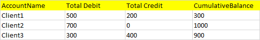 | accountname | total_debit | total_credit | cumulative_balance |