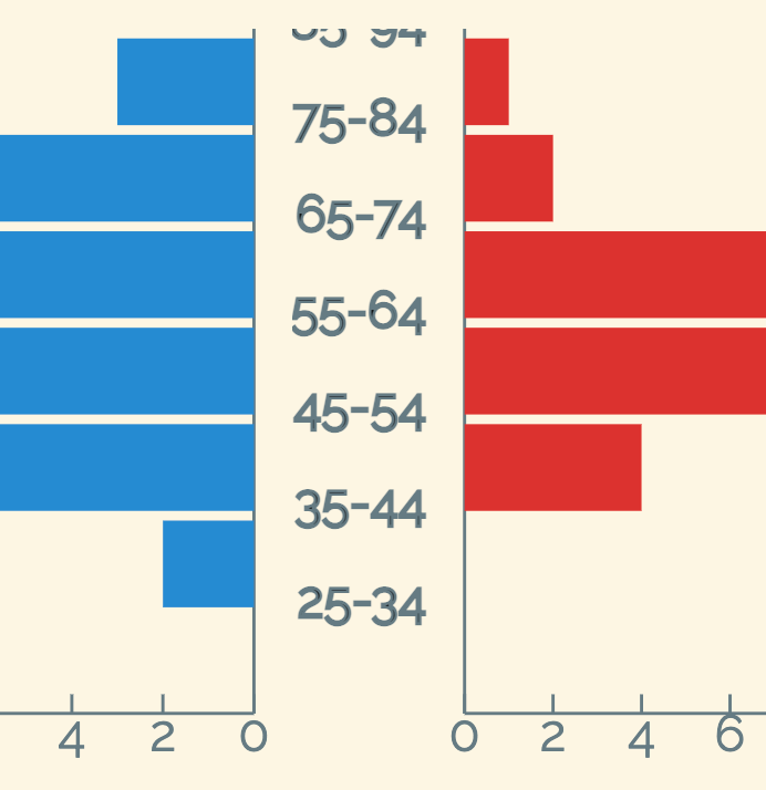 I’m writing a population pyramid using d3 + react. I’m using d3 for calculations and react for DOM rendering. Everything is working out pretty great, except for positioning the y-axis labels. Ideally, the first label would be positioned either along the axis, or center aligned in the bandwidth for that range. Or put another way, center-aligned around the same meridian as its respective bar.