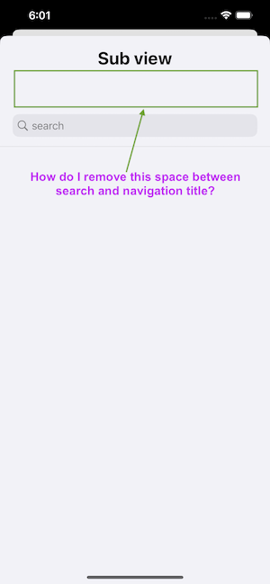 So let’s say I have a content view with a button which opens a modal/sheet (named "Main View") with a navigation title, a search bar and a button. In this main view, search bar and navigation title are positioned correctly. When I tap on button with main view, it navigates to another view (named "Sub View") which has search bar, navigation title and eventually will have a back button to navigate back to Main View. In this Sub View, I am seeing navigation title and search bar not positioned correctly i.e. there is a lot of space between navigation title and search bar.