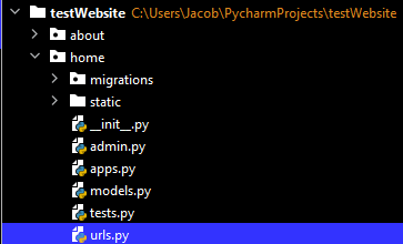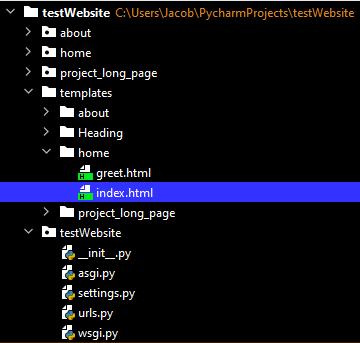 Your templates folder should be within your app folder home (under about), otherwise Django won’t find it. Check out https://django-project-skeleton.readthedocs.io/en/latest/structure.html for the proper file structure. My guess is the same could be said for the other folders withing your templates folder. You can have a templates folder in your root, but I don’t think this is what you will need in your case.