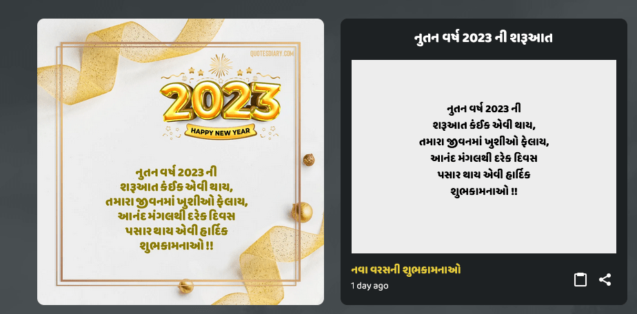 <p class="">nutan varsh 2023 ni<br> sharuat kaik evi thay,<br> tamar jivanam khushio felay,<br> anand mangalathi darek divas<br> pasar thay evi hardik<br> shubhakamanao !!</p>