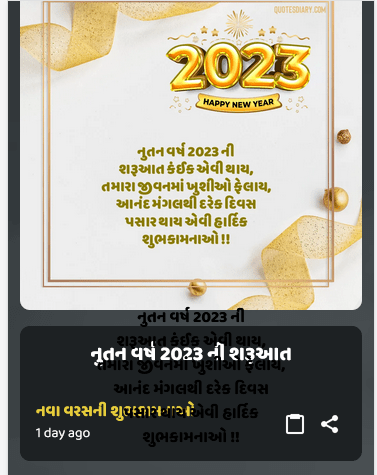 <p class="">નુતન વર્ષ 2023 ની<br> શરૂઆત કંઈક એવી થાય,<br> તમારા જીવનમાં ખુશીઓ ફેલાય,<br> આનંદ મંગલથી દરેક દિવસ<br> પસાર થાય એવી હાર્દિક<br> શુભકામનાઓ !!</p>