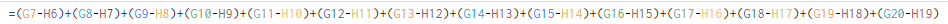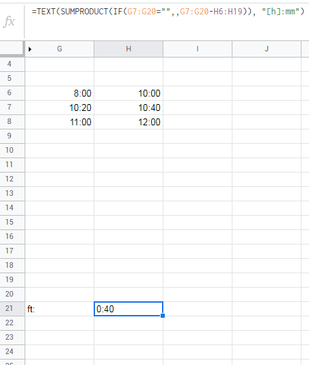 =TEXT(SUMPRODUCT(IF(G7:G20="";;G7:G20-H6:H19)); "[h]:mm")