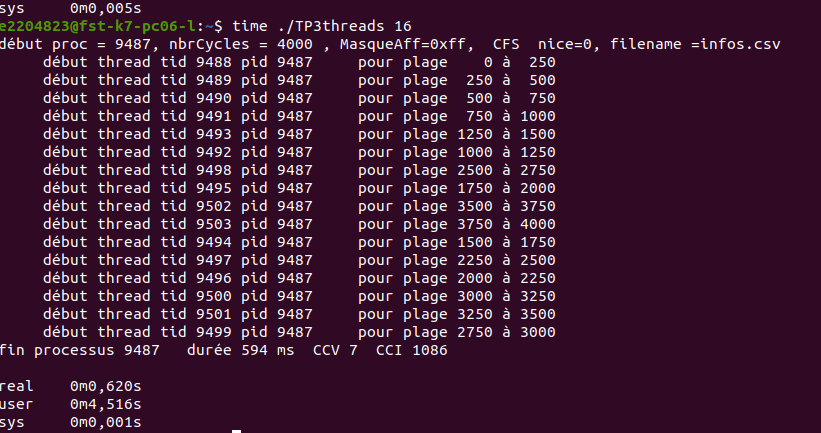 and for number of threads=16, the time of process execution was 594ms: