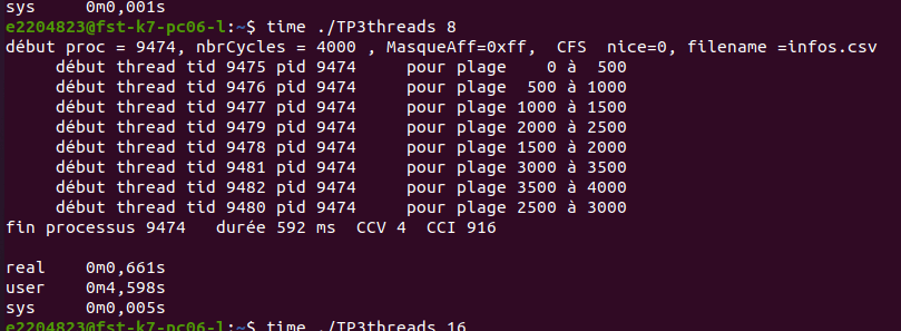 i run a process each time with different number of threads (work of process is distributed on those threads created), and i displayed time for the process to complete execution along with time information displayed by "time command" in Linux.
