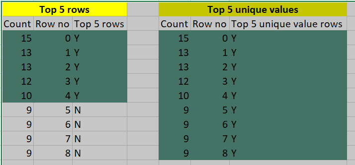 b) Rows with Top 5 unique values (this can return N > 5 rows if the top 5 values are repeating). See my example screenshot below where we have 8 rows for selecting top 5 unique values