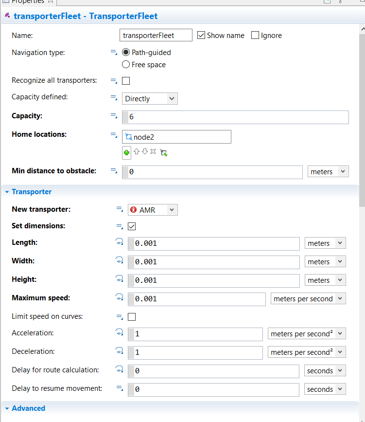 In my model I’ve a path-guided transporter fleet, but when they are close to eachother they are blocking eachother, since this is not the scope of my model (I want them just to override eachother ) is there a way to disable this option. I’ve already tried to set minimum distance to obstacle very low or use very small dimensions (see figure) but everything seems not to work.