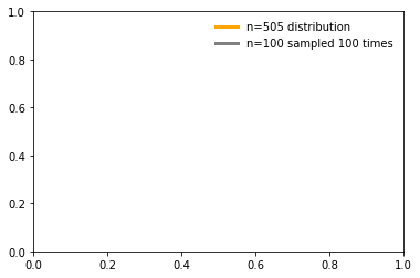 plt.legend(handles = myHandle, labels=['n=505 distribution', 'n=100 sampled 100 times'], frameon = False)
