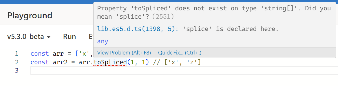 To use toSpliced, you need to set target to ESNext (for now, until there’s an ES2023 setting). Your playground targets ES2017, which wouldn’t support toSpliced or anything else from ES2018 onward. You also need to be using a fairly recent version of TypeScript (for instance, 5.1.6 doesn’t support it, but 5.2.2 does; I don’t know precisely where in there it was added).