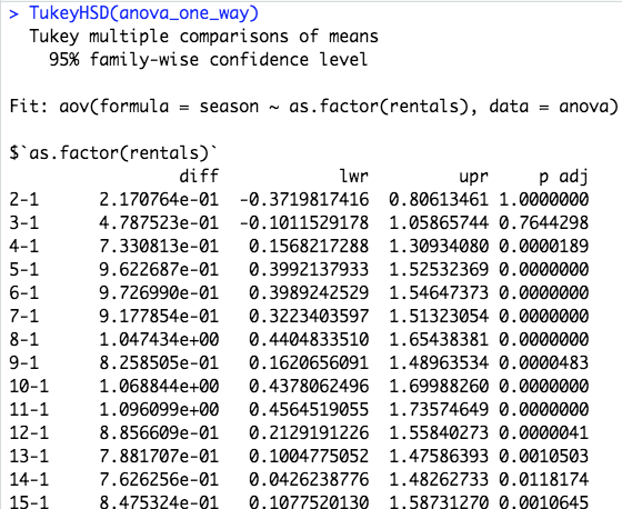 And the results are very disappointing. TukeyHSD returns 376896 rows, while I expect it to return just a few, comparing the seasons with each other. It looks like every single "rentals" row is being handled as a single group. This seems to be very wrong but I can’t find the cause. Is this a common TukeyHSD behaviour considering the big data set or is there an error in my code or logic, which causes this enormous unreadable list of values as a return?