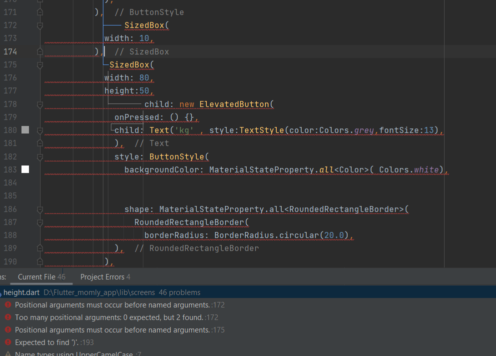 I’m a student new to flutter. I have created two buttons in one row. but it gives me an error like the picture shows. what should I do to the error? are there any wrong coding ?? how to correct this code. i keep space between buttons using a size box.