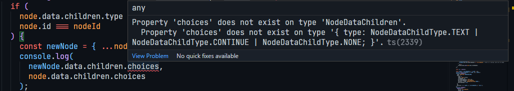 Property 'choices' does not exist on type '{ type: NodeDataChildType.TEXT | NodeDataChildType.CONTINUE | NodeDataChildType.NONE; }'.ts(2339)