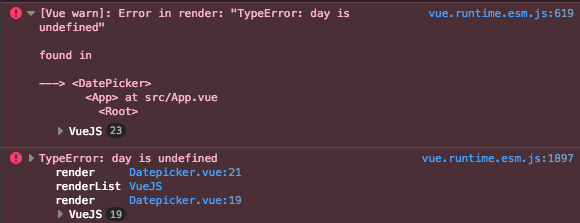It seems like Vue is trying to access the property before it is even seem so you would have to check if it exist first or just give the day array a default value
