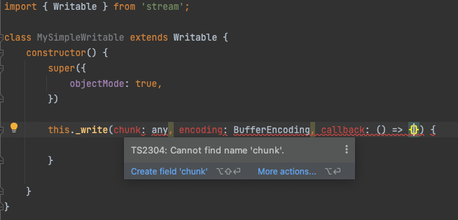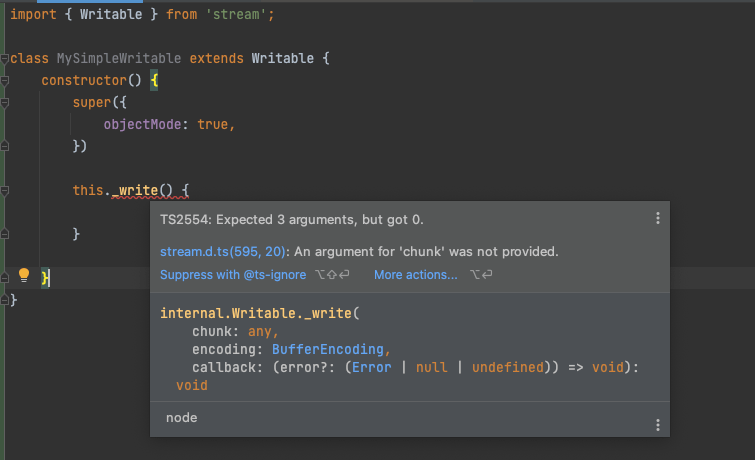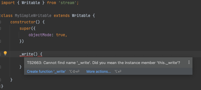 I am trying to create a simple class implementing Node stream.Writable but it seems I can’t get the syntax right, the compiler is always complaining: