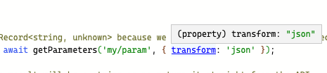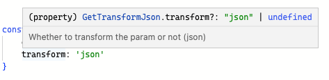 Now the docs/comment on the transform method work and seem to get picked up from the GetTransformJson interface (see (json) at the end of the comment:
