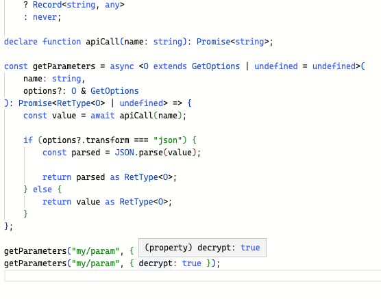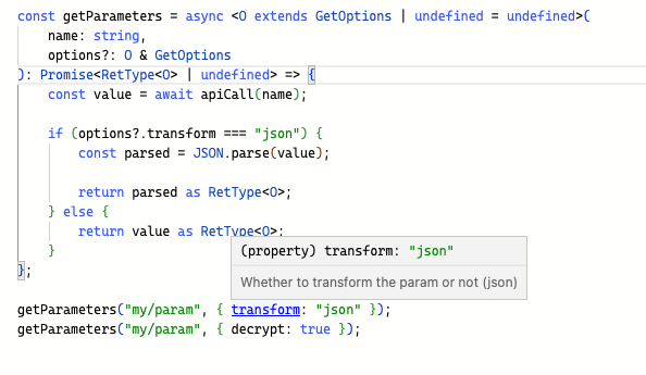 const getParameters = async <O extends GetOptions | undefined>(name: string, options?: O): Promise<RetType<O> | undefined> => {