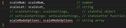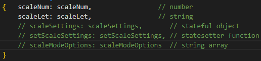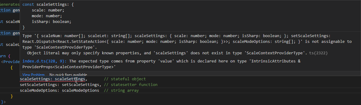 Type ‘{ scaleNum: number[]; scaleLet: string[]; scaleSettings: { scale: number; mode: number; isSharp: boolean; }; setScaleSettings: React.Dispatch<React.SetStateAction<{ scale: number; mode: number; isSharp: boolean; }>>; scaleModeOptions: string[]; }’ is not assignable to type ‘ScaleContextProviderType’.