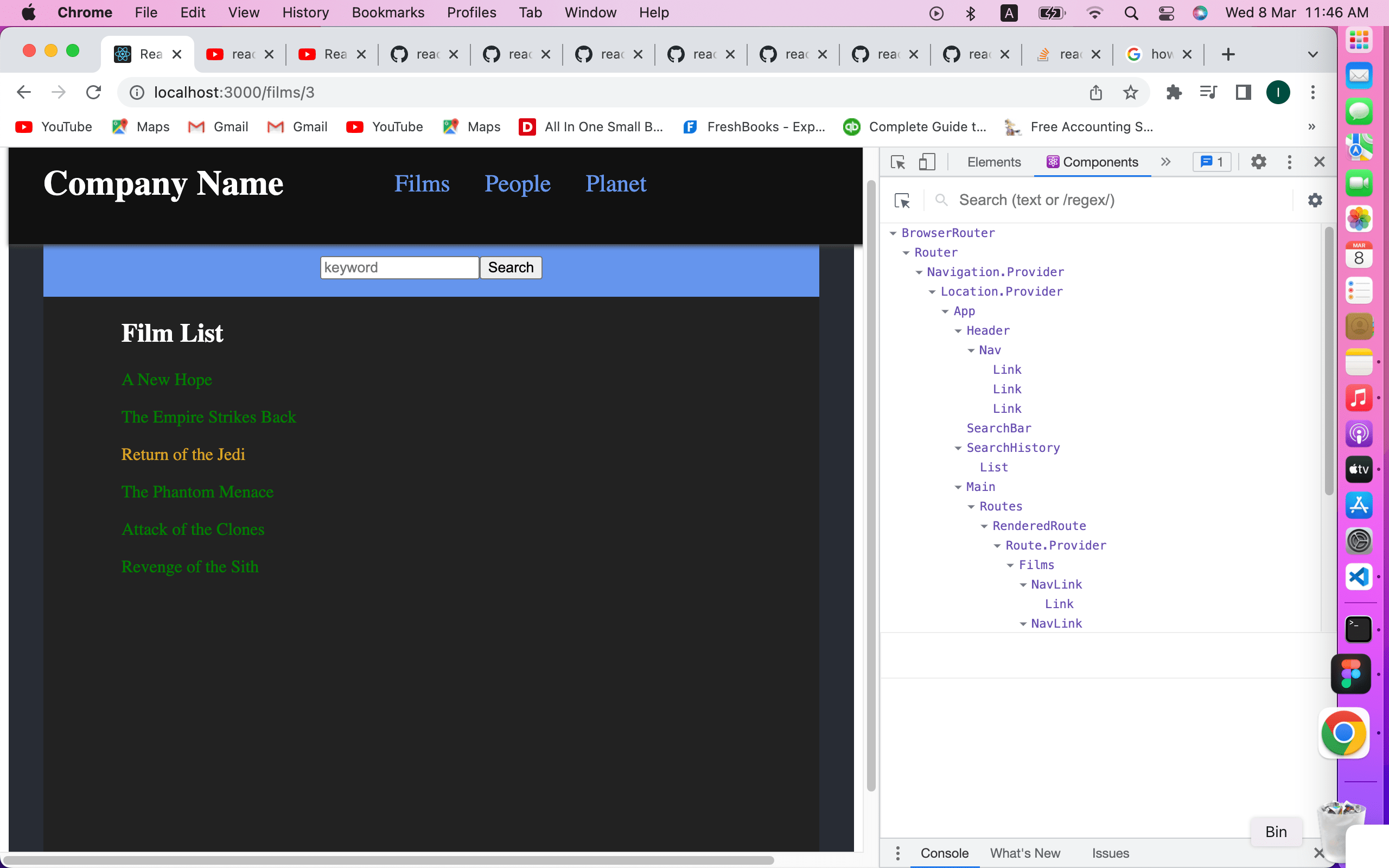 My routes are in Main component and nested route of "/films" which have film details is in Films component. I have attached the screenshot in which I am just able to access the specific id of films but not displaying film detail. Film is accessed via props in Films using method findFilms.