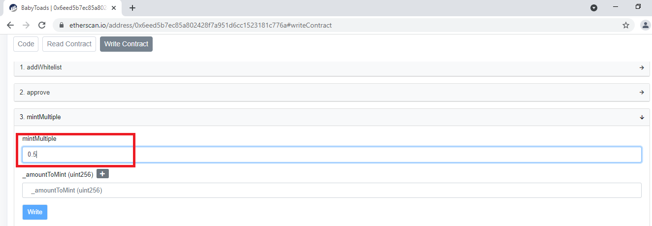 my_url = "https://etherscan.io/address/0x6eed5b7ec85a802428f7a951d6cc1523181c776a#writeContract"