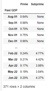 Since the values under Prime and Subprime headers are strings, I wrote the following to first get rid of the percentage symbol so I could subsequently convert the string to an int: