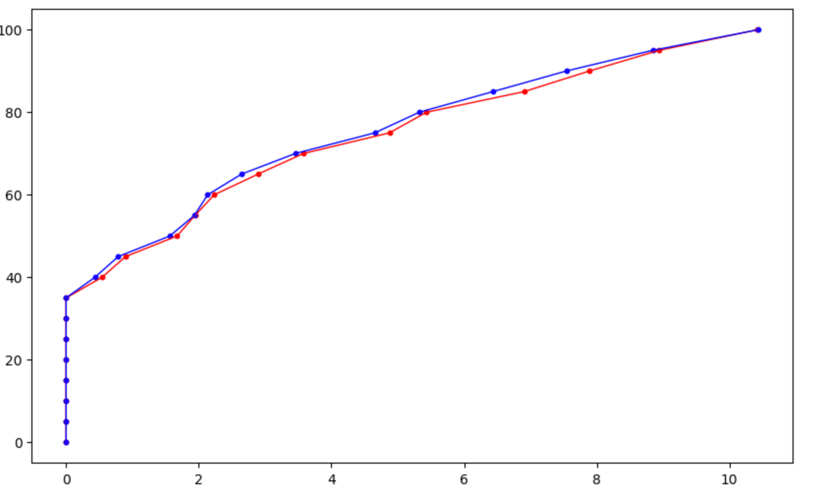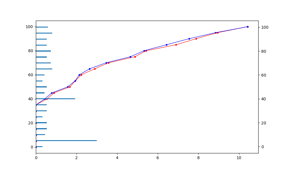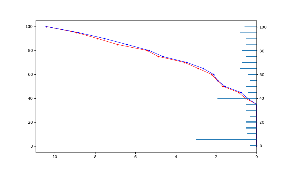 ax1.plot(data['series1'], data['levels'], linewidth=1, c='r', marker='o', markersize=3)