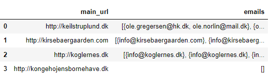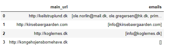 URL_WITH_EMAILS_DF = pd.DataFrame(data=[{'main_url': 'http://keilstruplund.dk', 'emails': ['ole.norlin@mail.dk', 'ole.gregersen@hk.dk', 'prima-rent@youseepost.dk', 'jb@rentind.dk', 'frisoren01@gmail.com','stigterndrup@gmail.com', 'psn@psn.dk', 'samuel@malerfirmaet-lykkebo.dk', 'jan@mundt-reklame.dk', 'nordsjalland@phonixtag.dk', 'jp@rudersdalmaleren.dk', 'vvs@hestetangen.dk', 'steenkragelund@mail.tele.dk', 'kasserer@keilstruplund.dk']},