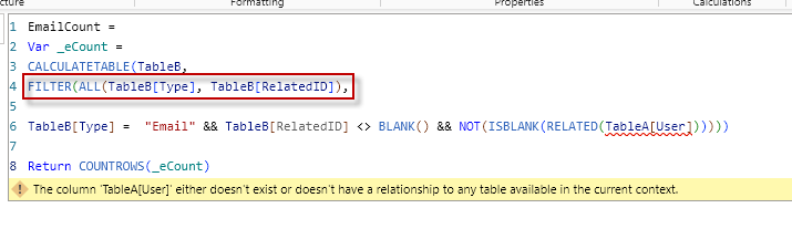 TableB[Type] = "Email" && TableB[RelatedID] <> BLANK() && NOT(ISBLANK(RELATED(TableA[User])))))