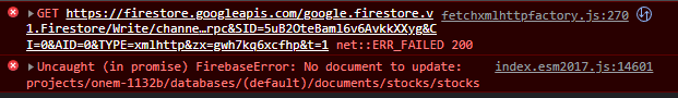 Your code is trying to update a document with the path "/stocks/stocks". The error message is telling you that document doesn’t exist. I’m inclined to agree, since the document you show in the screenshow has the path "/stocks/sL..G1" (redacted). You will need to use the correct document ID to build a path to the document to update.