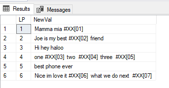 Declare @YourTable Table ([LP] int,[Text] varchar(50)) Insert Into @YourTable Values