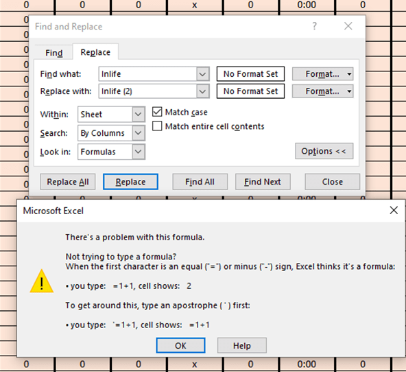 (I have tried to just use the search and replace function of excel but that gave me an error about the formula)