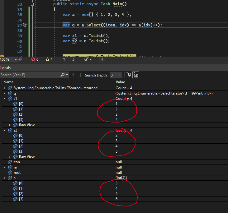 The first time, Select did a[idx]++ which e.g. bumped array index 0 up from 1 to 2, but the ++ operation returns the value before the increment e.g. 1 (and the a[0] is now 2).. This means you see "the original array" i.e. 1, 2, 3, 4 reflected in the z1 result, but z2 is the bumped up once (and the a is full of numbers that have been bumped twice)