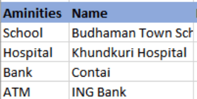 I have the dataframe below and I want to create a new one with 2 columns one named Amenities which will include either "nn_bank" or "nn_hospital" as value and the other column "Name" with the name of the nn_bank or nn_hospital.