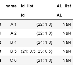 out = pd.concat([df.groupby('name')[x].value_counts(normalize=True).round(2).reset_index(level=0).groupby('name').agg(dict) for x in ['id','AL']],axis=1).add_suffix('_list').reset_index()