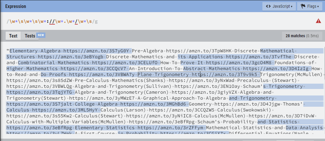 s = """Elementary Algebra https://amzn.to/3S7yG0Y Pre-Algebra https://amzn.to/3TpW8HK Discrete Mathematical Structures https://amzn.to/3eBYogb Discrete Mathematics and its Applications https://amzn.to/3TvfThe Discrete and Combinatorial Mathematics https://amzn.to/3CELUfO"""