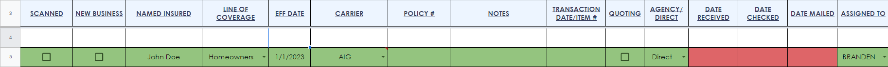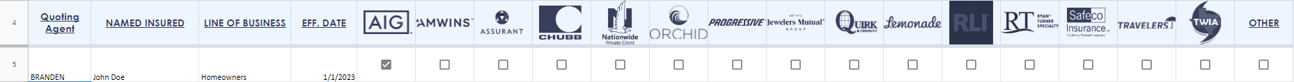 - The loop function seems to only loop one time. AIG is the first carrier. If a checkbox is selected under the new business column on a separate sheet, a row will appear with a checkbox underneath AIG only.