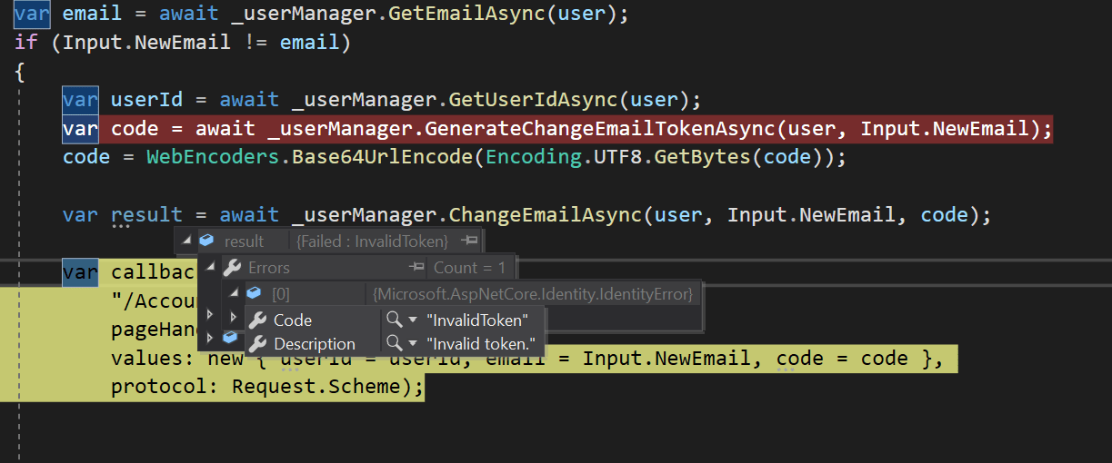 var code = await _userManager.GenerateChangeEmailTokenAsync(user, Input.NewEmail);