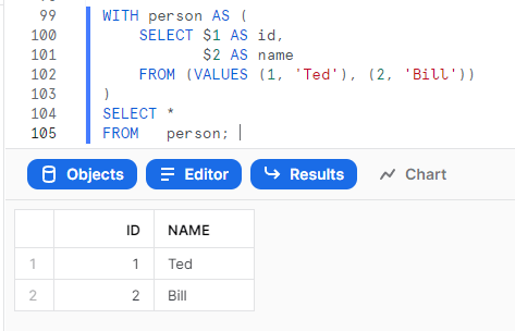 AS (VALUES (1, 'Ted'), (2, 'Bill'))