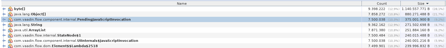 It could be important to check which component produced all of those pending invocations. You can perhaps try to place a breakpoint into the PendingJavaScriptInvocations constructor; the breakpoint won’t stop the JVM but would only log the caller. Alternatively, PendingJavaScriptInvocations.owner may reference the culprit component, you could try to discover that in the heap dump.