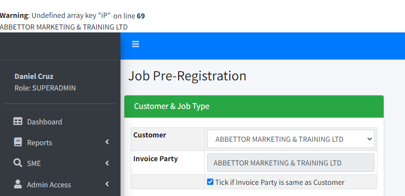 When check box is selected, it copies value from customer to invoice party. So I am assuming that when check box selected. value is automatic. but it is saying undefined array key.