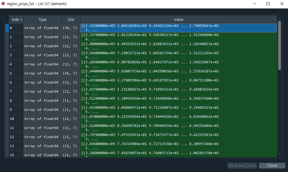 I have a list(region_props_list), size = 37, which has the values of 2D numpy arrays like below.